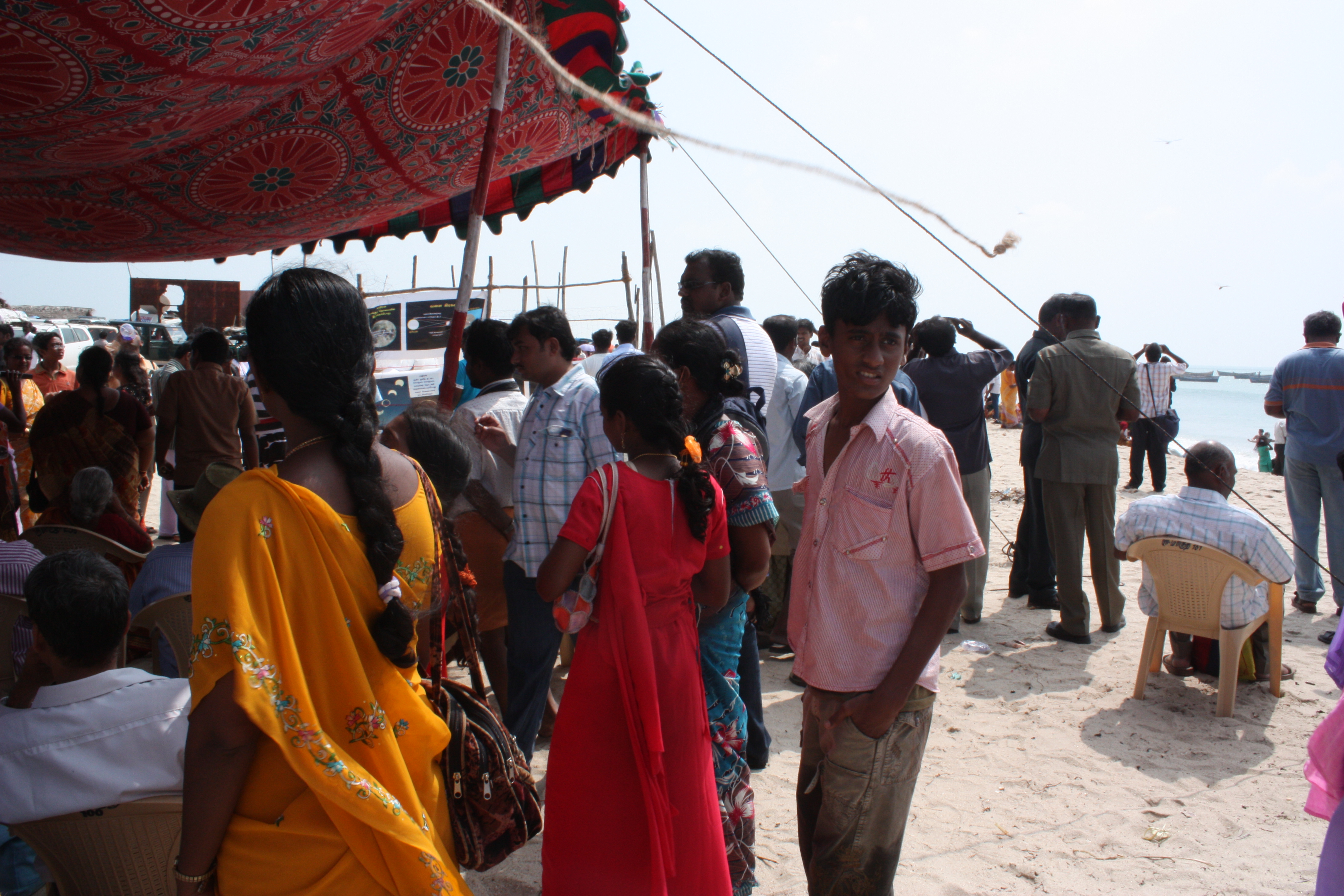 it was a short distance away, but as i got closer from a deserted town the atmosphere changed! there were autos, cars piled up on this tiny two lane road. bikes zipped in and out… a traffic jam in a tiny coastal village! it was having its moment of glory. there were people all over the beach. danushkodi is on this narrow strip of land that juts out into the sea like a tongue of a frog darting out to catch the fly. on both sides is blue (blue, blue) water, and then clean sand and a narrow road. i was on this narrow road… the auto guy said people had been pouring into town since yesterday. i let go of the auto guy, bought him a pair of glasses and walked towards the crowds!