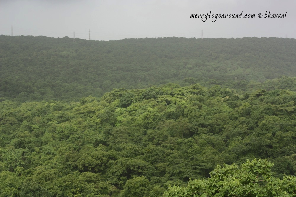 the rain stopped appropriately when we reached the mid-way point… and we stood there on this tiny plateau like point with a clear view of the deep valleys in front of us, gorai and the pagoda in the distance to the right, and hills on all other sides. it was GREEN! and quiet. suddenly startled by a cacophony of crows, ganesh told us they would be feeding on some leopard’s kill… the scavengers cleaning up…